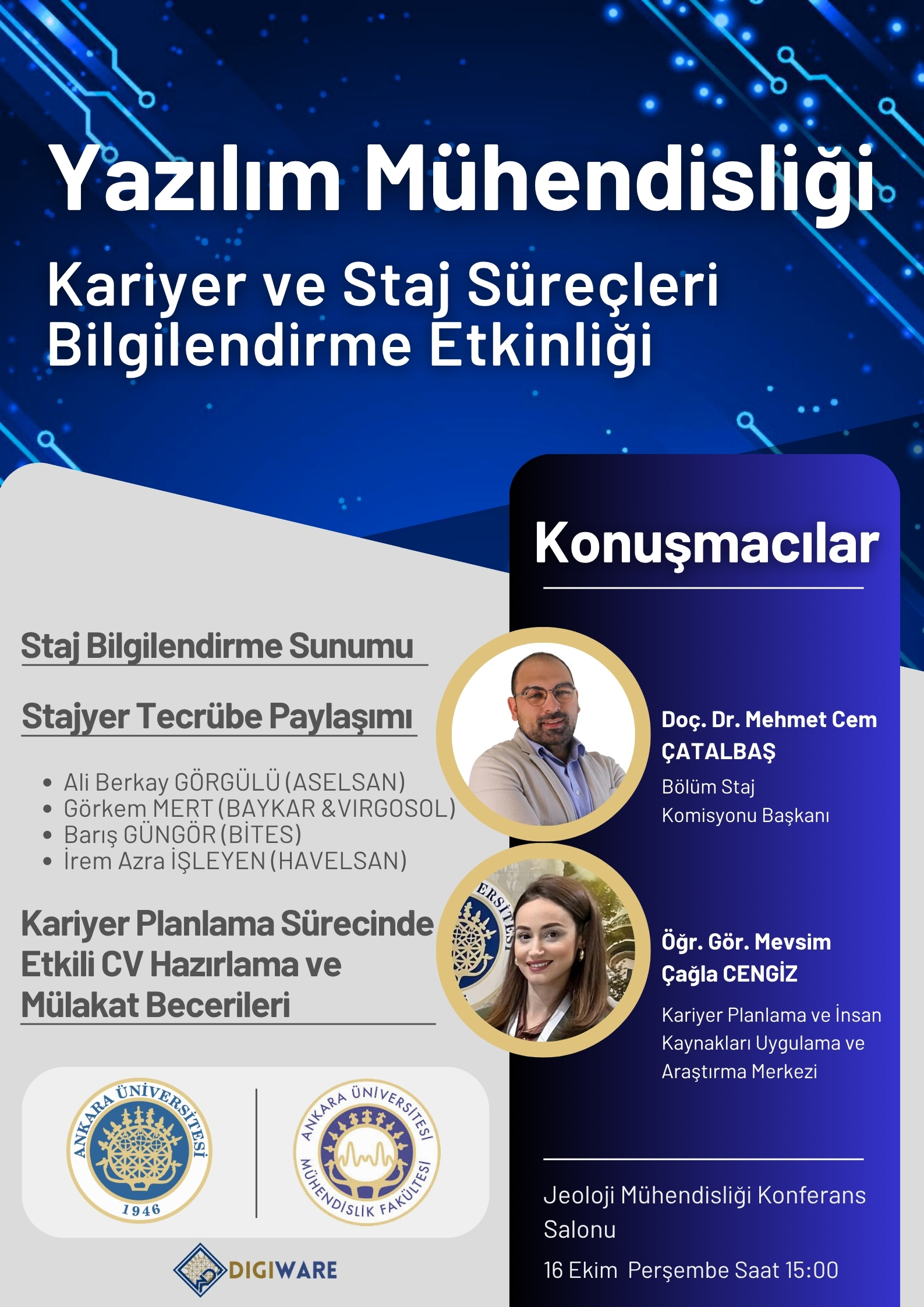 Yazılım Mühendisliği Bölümü olarak, öğrencilerimizin kariyer planlama ve staj süreçlerinde farkındalıklarını artırmak amacıyla “Kariyer ve Staj Süreçleri Bilgilendirme Etkinliği” düzenliyoruz.