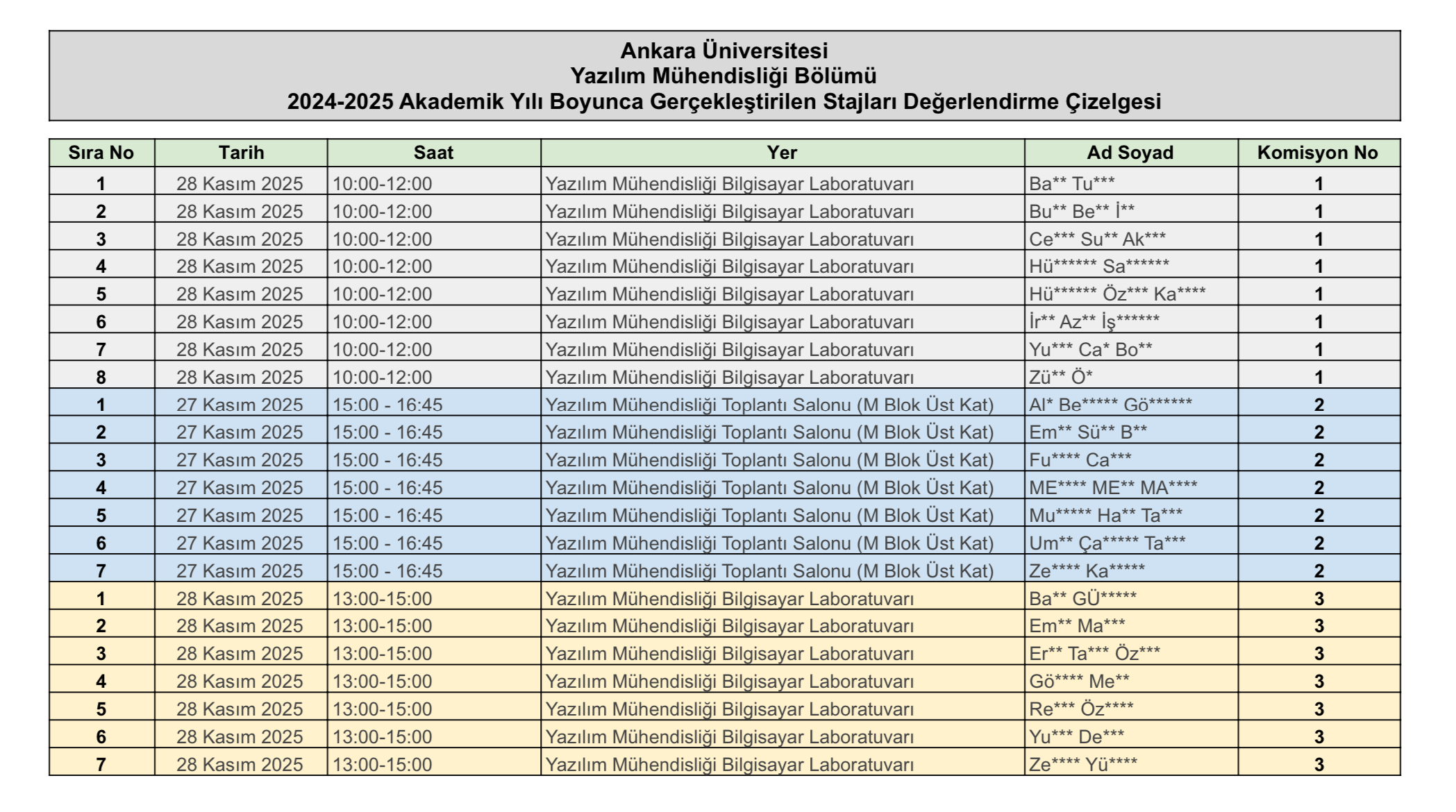 Staj değerlendirmeleri kapsamında her öğrencinin yaklaşık 10 dakikalık bir sunum yapması gerekmektedir. Bu sunumlar, 27-28 Kasım 2025 tarihleri arasında yapılacaktır.
