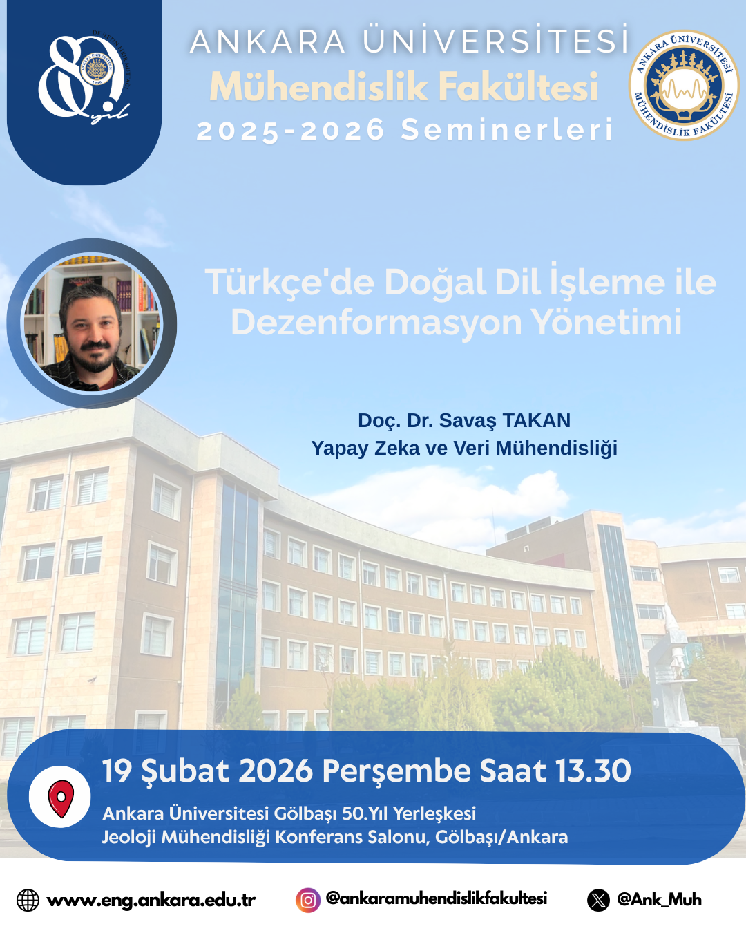 Fakültemiz 2025-2026 Eğitim Dönemi Seminerleri başlıyor.“Türkçe’de Doğal Dil İşleme ile Dezenformasyon Yönetimi” başlığı ile Yapay Zeka ve Veri Mühendisliği Bölümü öğretim üyesi Doç. Dr. Savaş TAKAN tarafından, 19 Şubat 2026 Perşembe, saat 13.30’da Jeoloji Mühendisliği Konferans Salonu‘nda gerçekleştirilecektir.