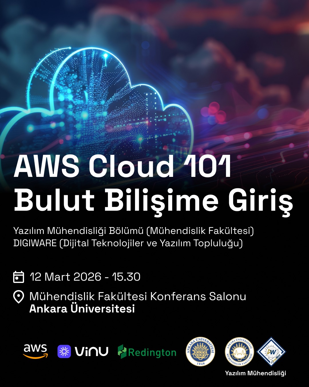 Redington, AWS ve Vinu Digital iş birliğinde, Ankara Üniversitesi Yazılım Mühendisliği Bölümü ve DIGIWARE (Dijital Teknolojiler ve Yazılım Topluluğu) ev sahipliğinde gerçekleştirilecek olan “AWS Cloud 101 – Bulut Bilişime Giriş” etkinliğine davetlisiniz.