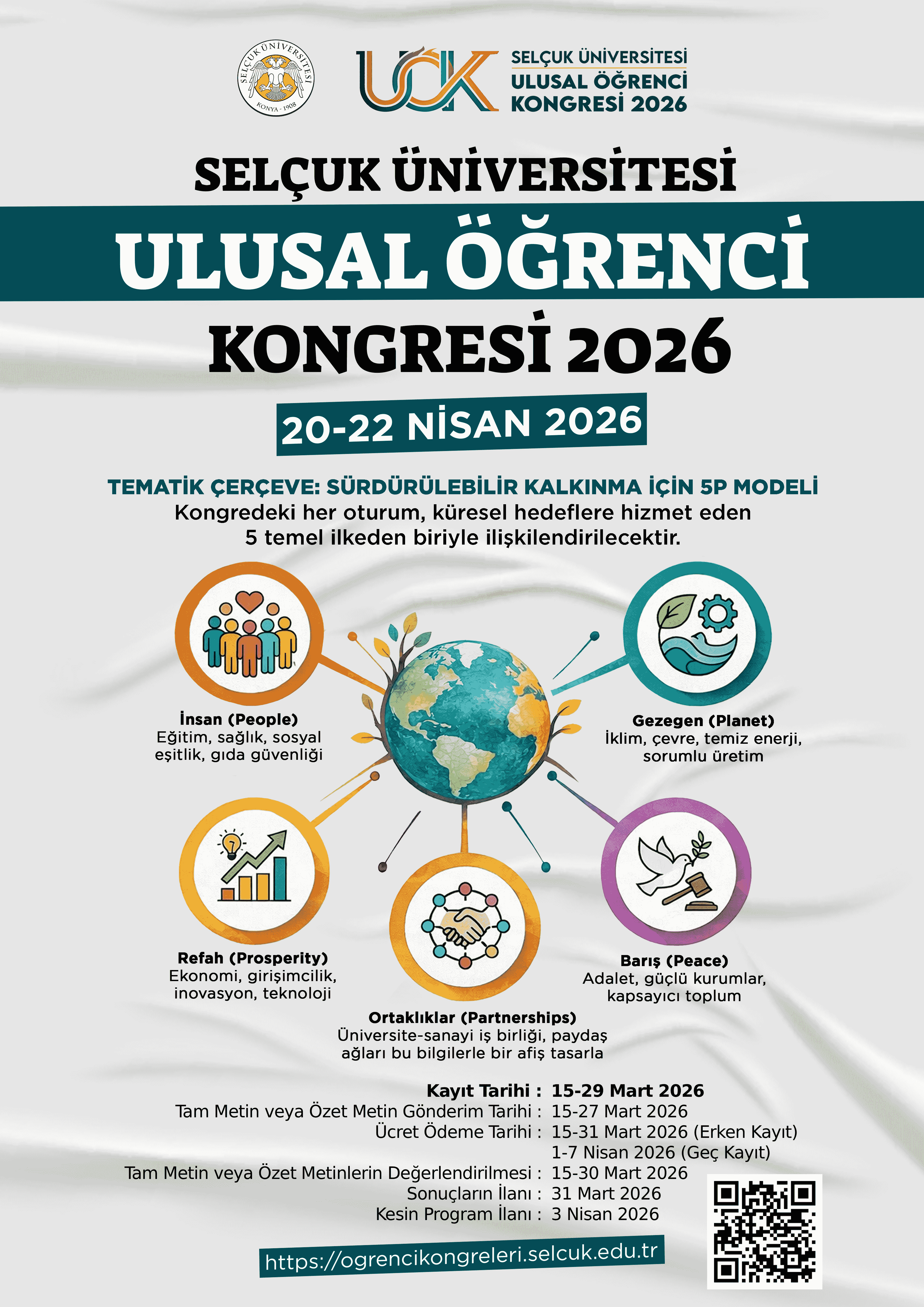 Selçuk Üniversitesi tarafından 20-22 Nisan 2026 tarihleri arasında “Selçuk Üniversitesi Ulusal Öğrenci Kongresi 2026” düzenlenecektir.